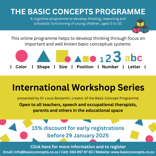 The Basic Concepts Programme© is a holistic and developmentally orientated metacognitive intervention programme for young children who experience language, information processing and socio-emotional barriers towards learning. |
