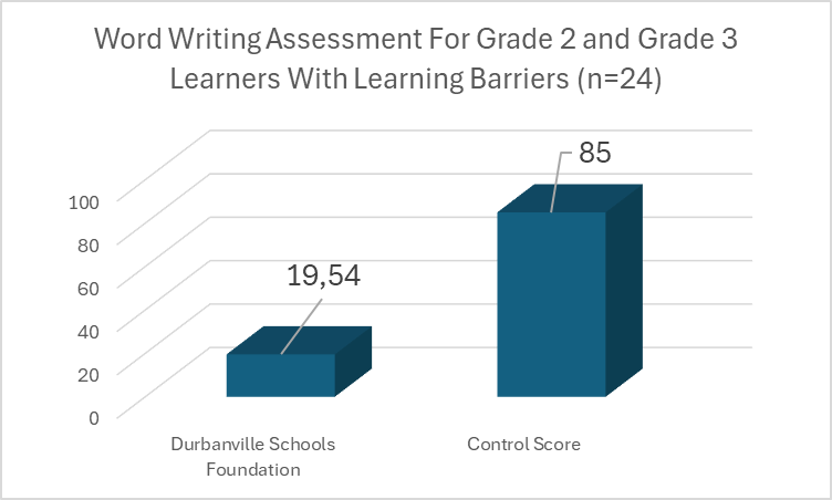 The results of the Word Test reveal significant delays in the ability to write words in the language of instruction among learners with learning barriers in the project schools. For instance, Grade 1 learners from a disadvantaged school in Cape Town could write 24 words, whereas learners from a more privileged school could write 58 words.