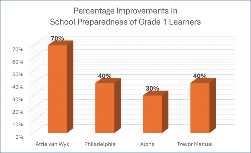 The results show significant improvements in school preparedness across all four project schools, with Attie van Wyk, Philadelphia and Trevor Manual making the greatest gains.