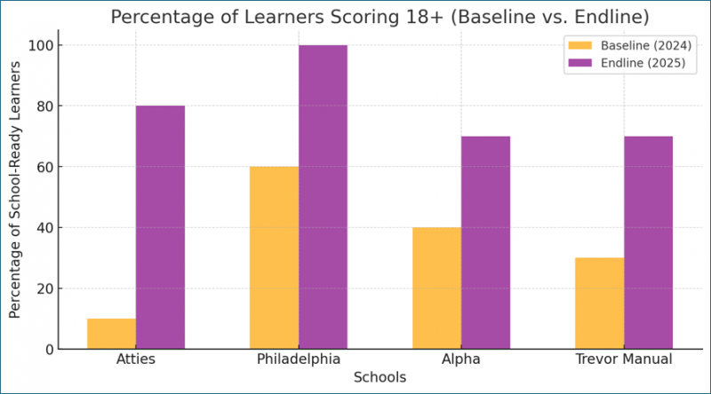 While no schools initially met the 18-point benchmark at baseline, all have now surpassed this level, highlighting the positive impact of the intervention on learners' readiness for school.