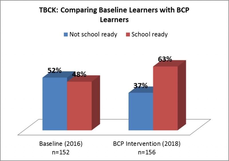 The study found that a majority (63%) of the learners who received the BCP intervention were ready for school learning, while 48% of control learners were school ready at the start of the project.