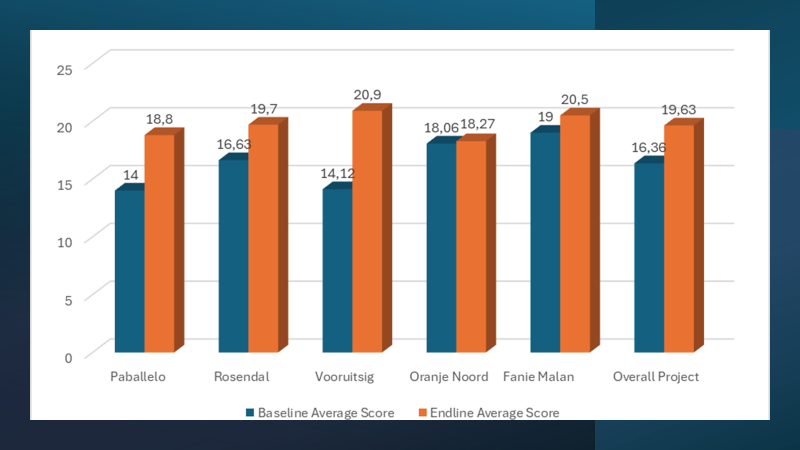 A clear upward trend is evident in the results across all five schools: Average scores increased from the "Weak" range (11–17) into the "Average" (18–20) and even "Strong" (21–24) categories. Vooruitsig and Pabalello showed especially notable gains, while the overall project average rose from 16.36 to 19.63.