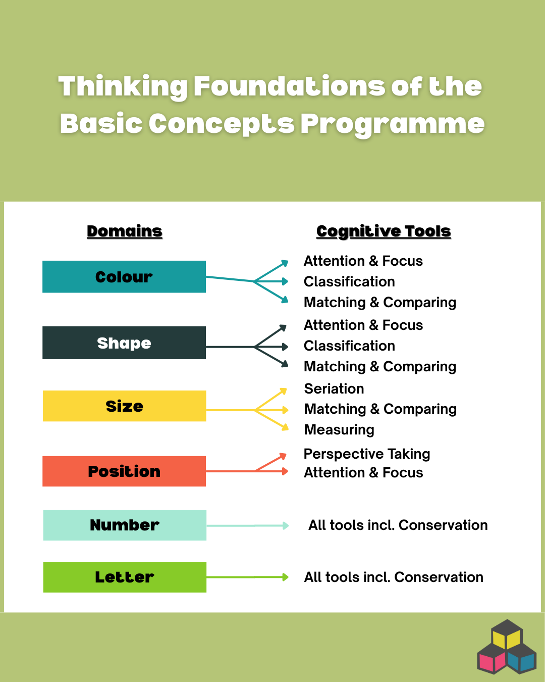 In the Basic Concepts Programme (BCP), every domain—Colour, Shape, Size, Position—does more than teach vocabulary. Each one lays down cognitive tools like attention, comparison, classification, seriation, perspective taking, and conservation.