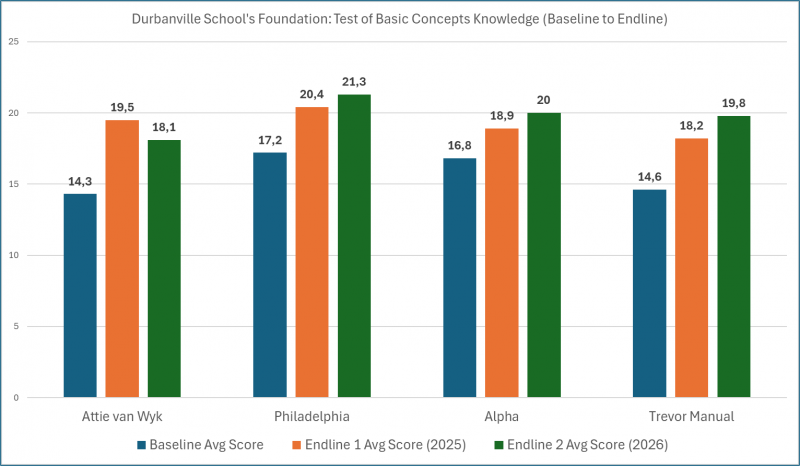 Over the past three years, we have monitored Grade 1 preparedness using our Test of Basic Concepts Knowledge (TBCK). This structured assessment measures children’s understanding of essential foundational concepts such as colour, shape, size, position, number and letter. Learners are selected using a consistent sampling process, and the test is administered in the same way each year, allowing us to track reliable trends over time.