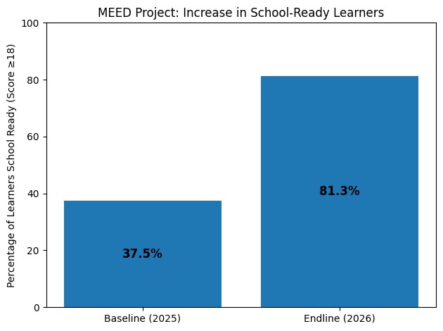 Most importantly, the proportion of learners considered school-ready (scoring 18 or higher) more than doubled — rising from 37.5% at baseline to 81.3% at endline.